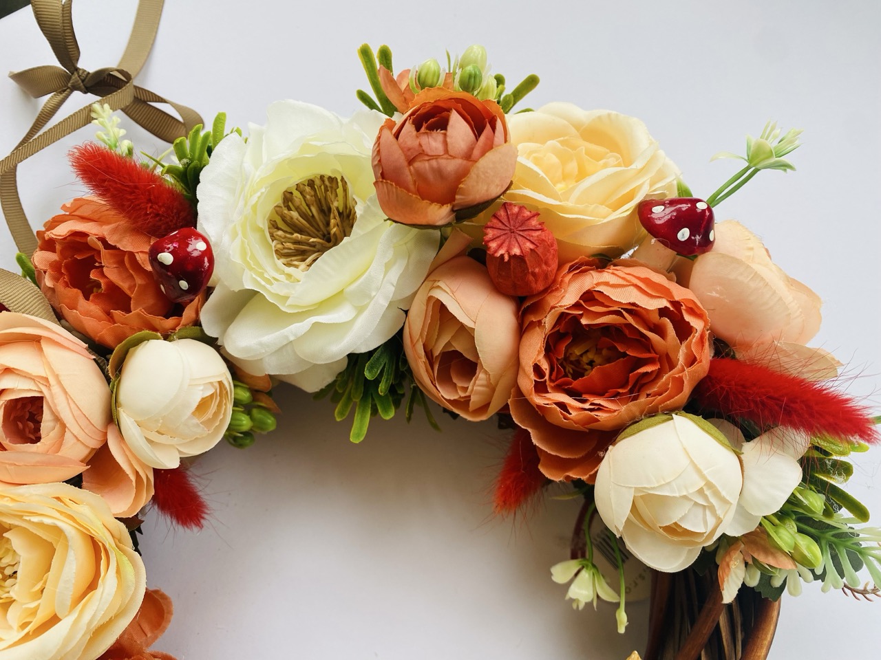 Száraz termésből készült narancs-barna ajtódísz.