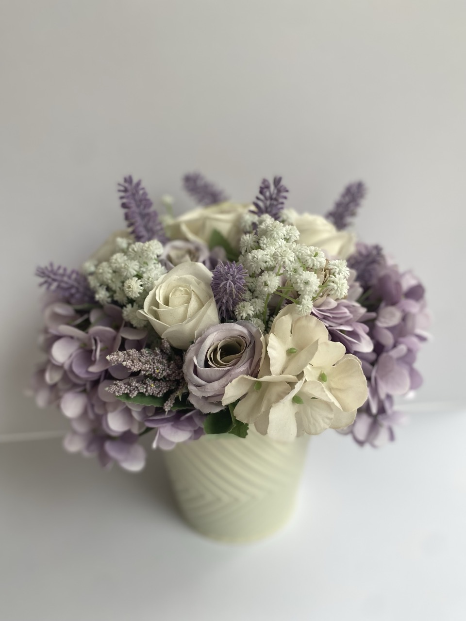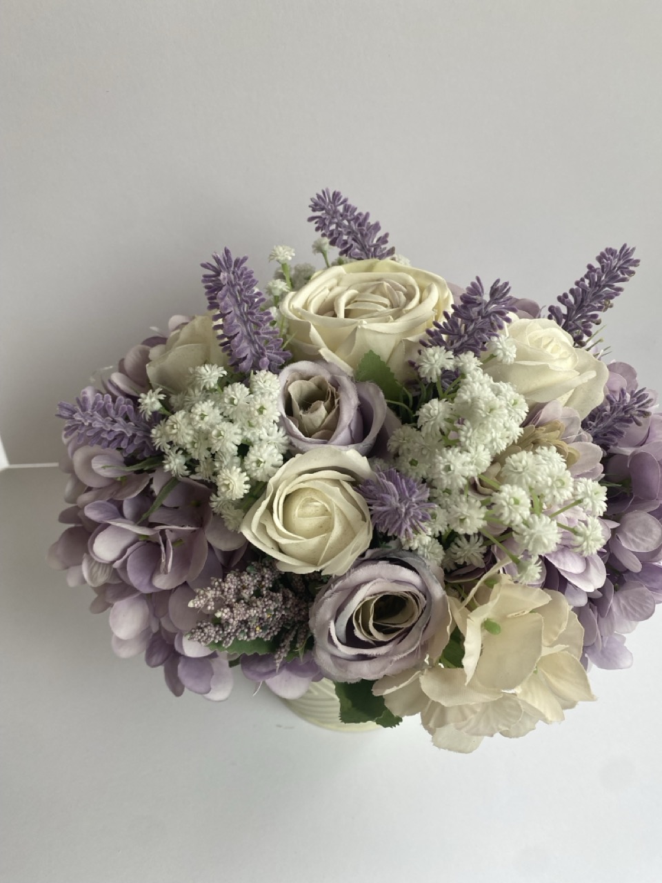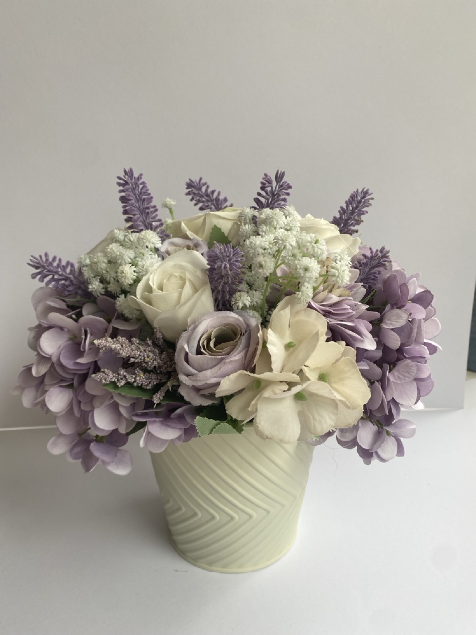 Fa dobozba szellőrózsa és hortenzia