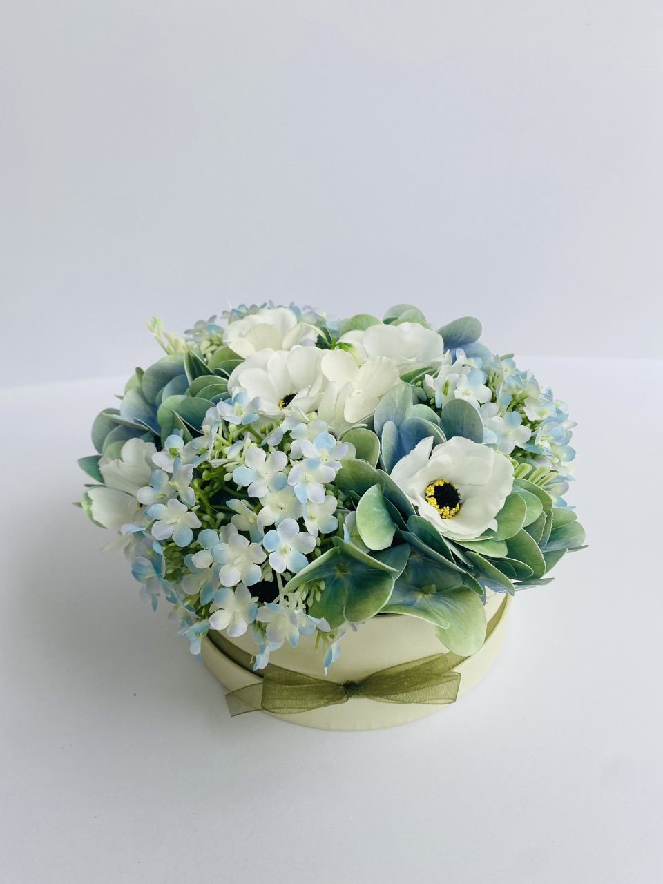 Fa dobozba szellőrózsa és hortenzia